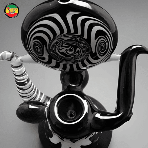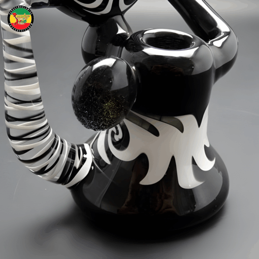 - Điểm nổi bật nhất của sản phẩm nằm ở thiết kế hình học xoáy ảo giác phía trên thân tẩu. Vòng xoáy đen trắng mô phỏng hiệu ứng thôi miên thị giác – vừa mang giá trị thẩm mỹ cao, vừa tạo điểm nhấn nghệ thuật độc đáo. Phần tay cầm và chi tiết thủy tinh uốn lượn được xử lý khéo léo, tạo cảm giác như một tác phẩm điêu khắc hiện đại.